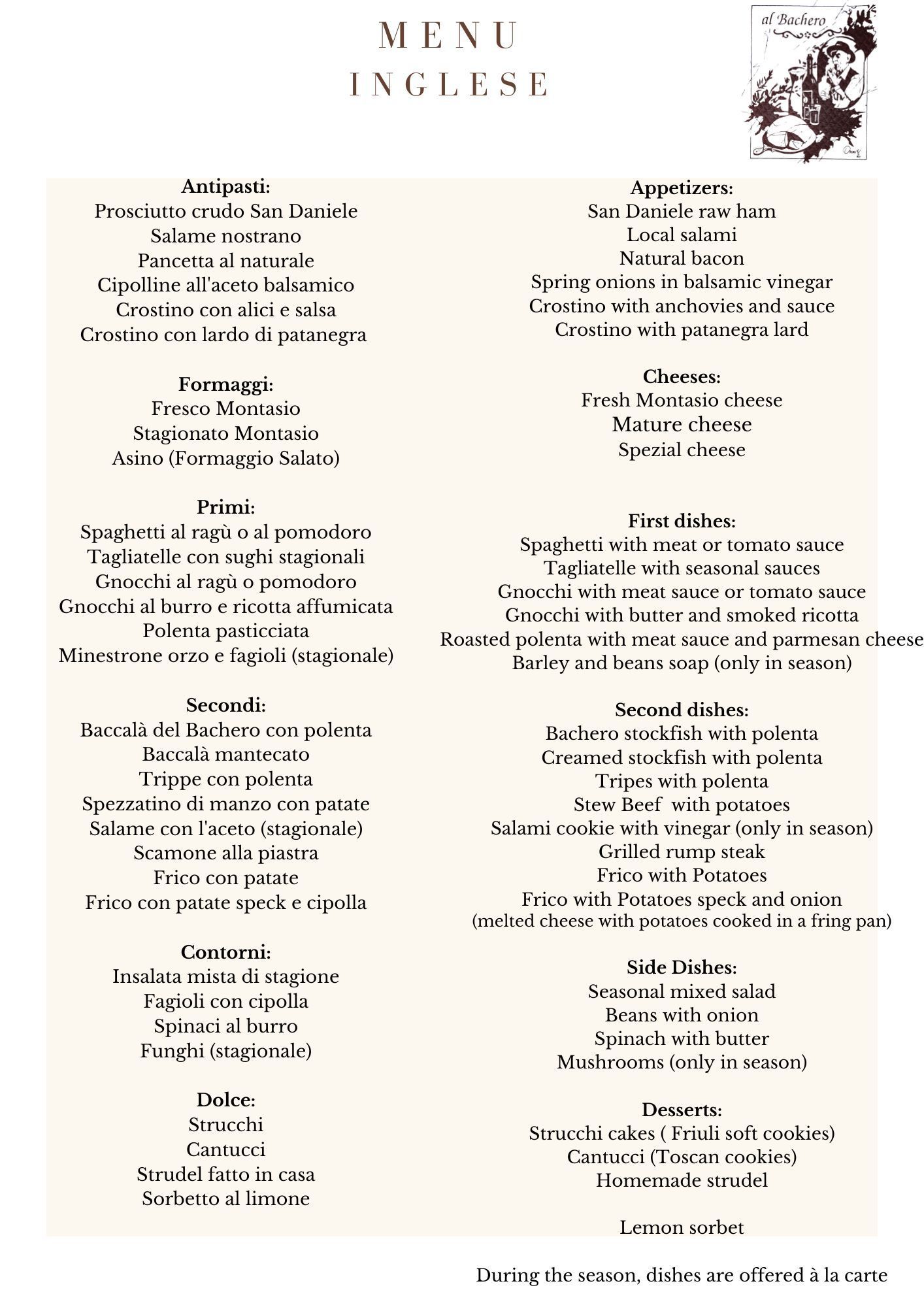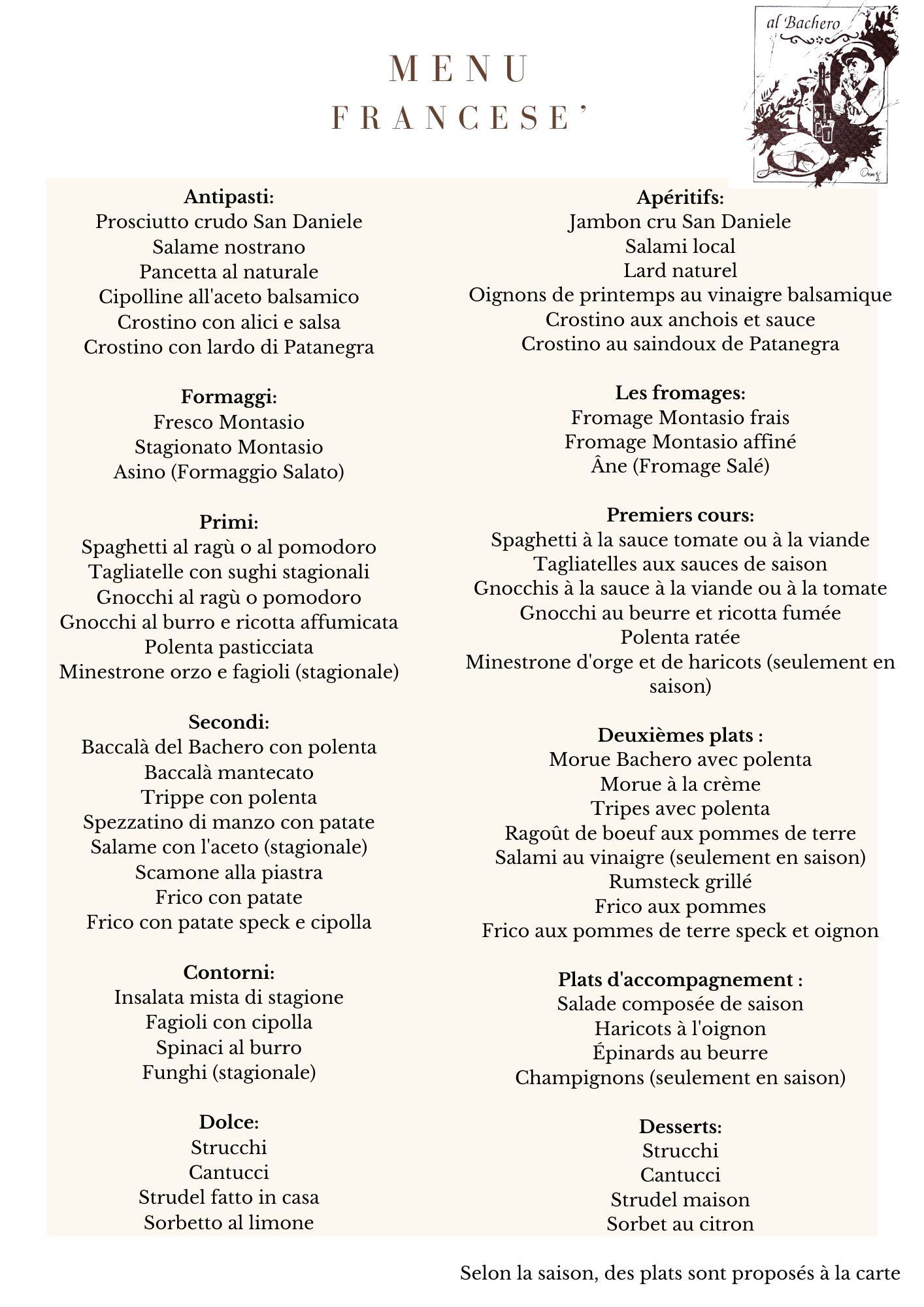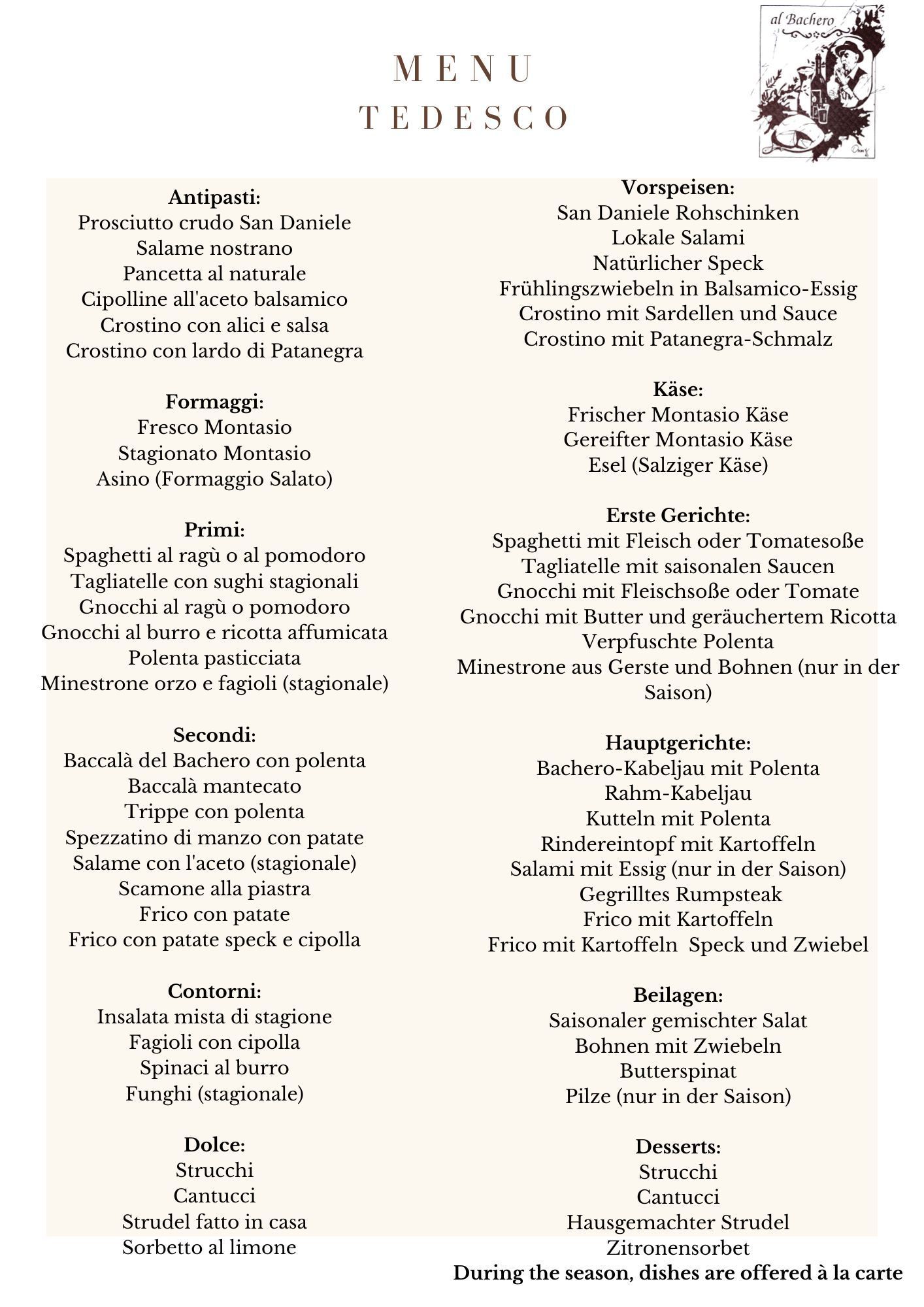 dal 1897 Antica Osteria <<al Bachero>> Cucina casalinga Specialità Baccalà e trippe con polenta